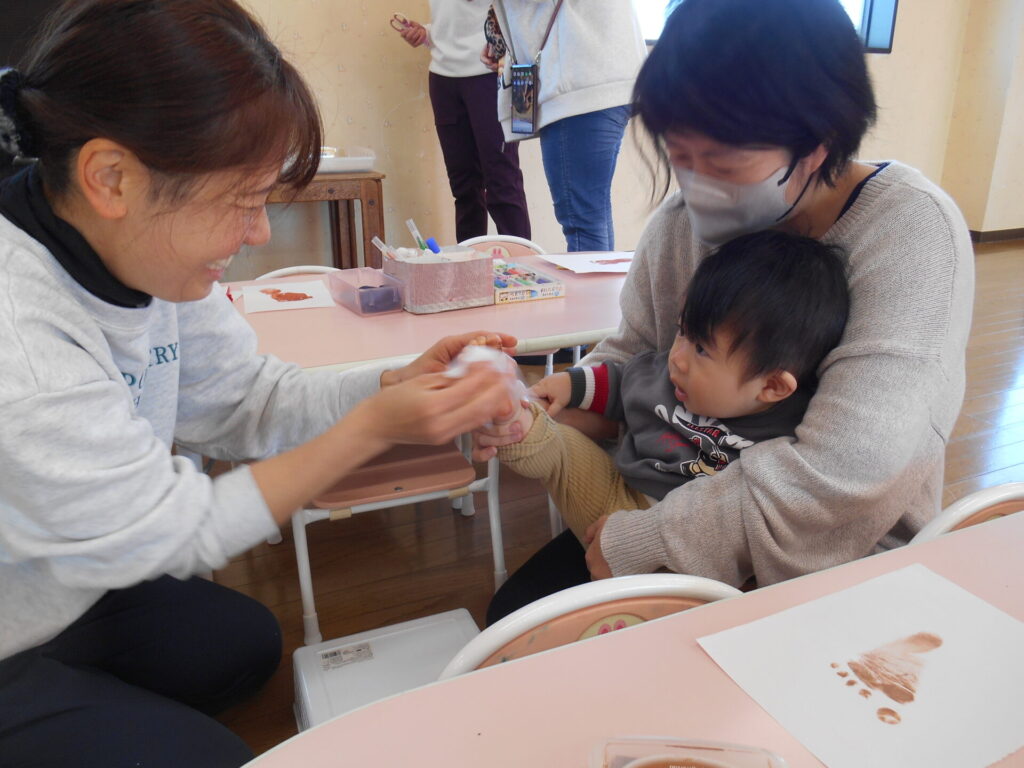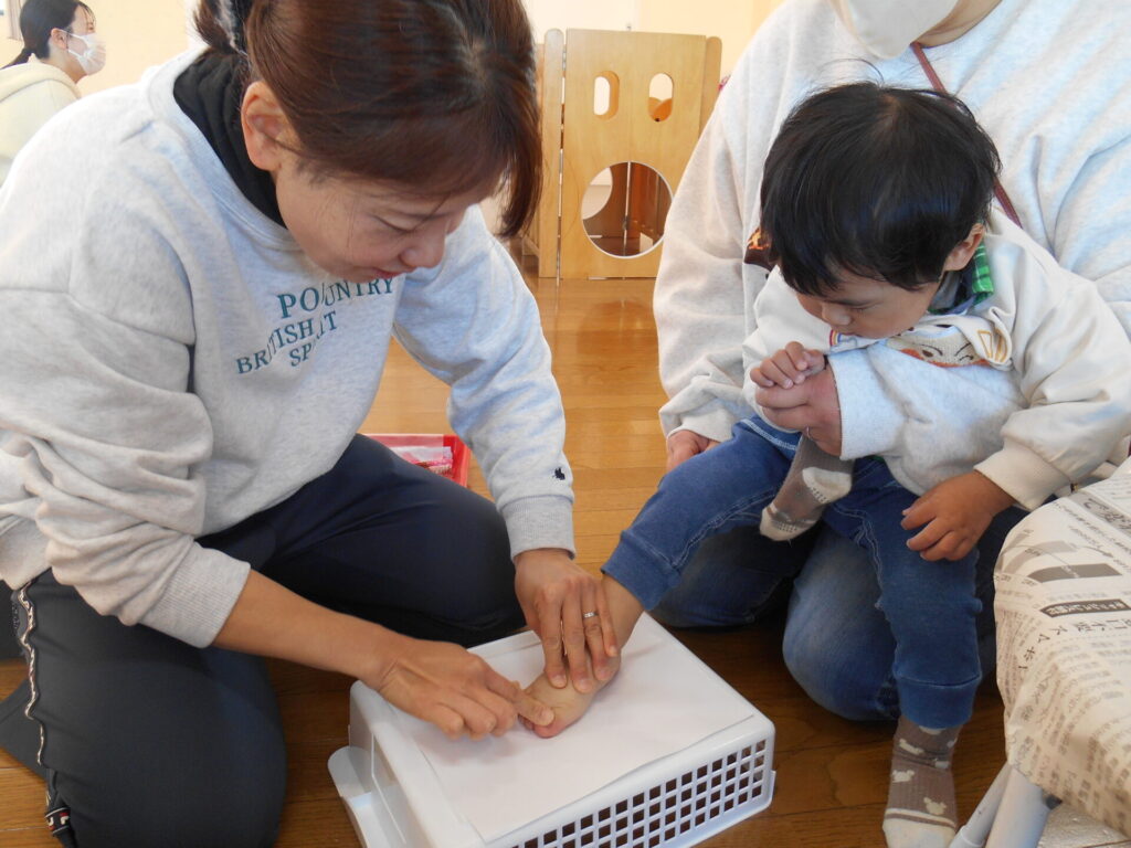 いきなりですが・・・早速あしに絵の具をペッタン! 嫌がるかな?の心配をよそに、ママと楽しく上手に
