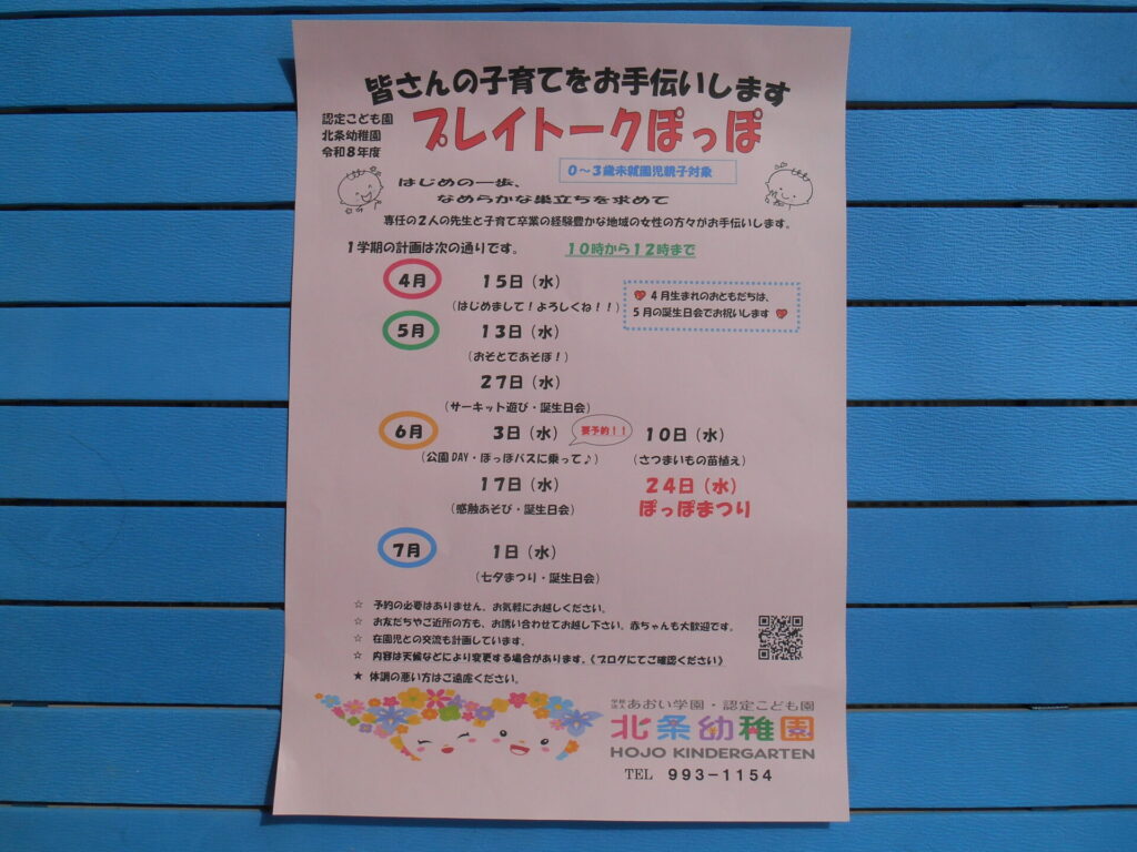 2026.04.9 ぽっぽ 令和8年度 プレイトークぽっぽ 始まります!! 🌸桜満開🌸 春がきましたね( ◠‿◠ ) プレイトークぽっぽも始まります!! 1学期の活動内容です。↓↓ 初回は、4月15日(水)『はじめまして!よろしくね!!』です。 ぜひ、あそびに来てくださいね(#^.^#)